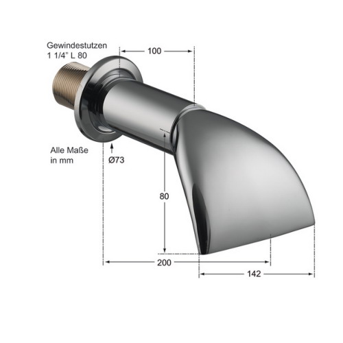 Großvolumige Schwallbrause - Schwalldusche in der Gewerblichen Anwendung - in elegant bombierter Form zur optimierten Strahlbildung, mit fest verbundenem glatten Messingrohr Ø 50 mm, Anschluss-Gewindestutzen L 50 mm ohne Kugelgelenk & massiver Schubrosette Ø 73 mm – Höhe 15 mm.